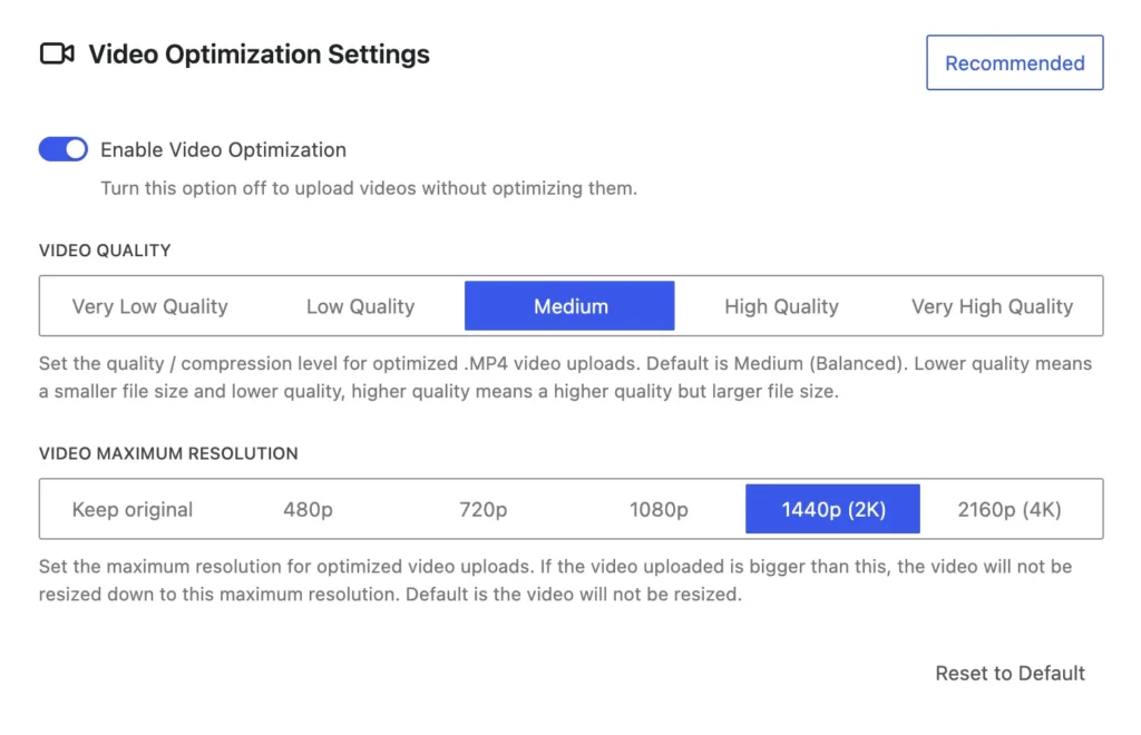 💡 You can click on the Recommended button for a preset of our recommended settings for Video Optimization.