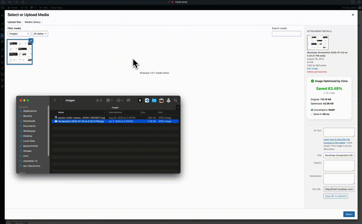 Unlike server-side plugins, Cimo processes everything in your browser. No external APIs, no server processing, no waiting – just instant optimization as you upload.